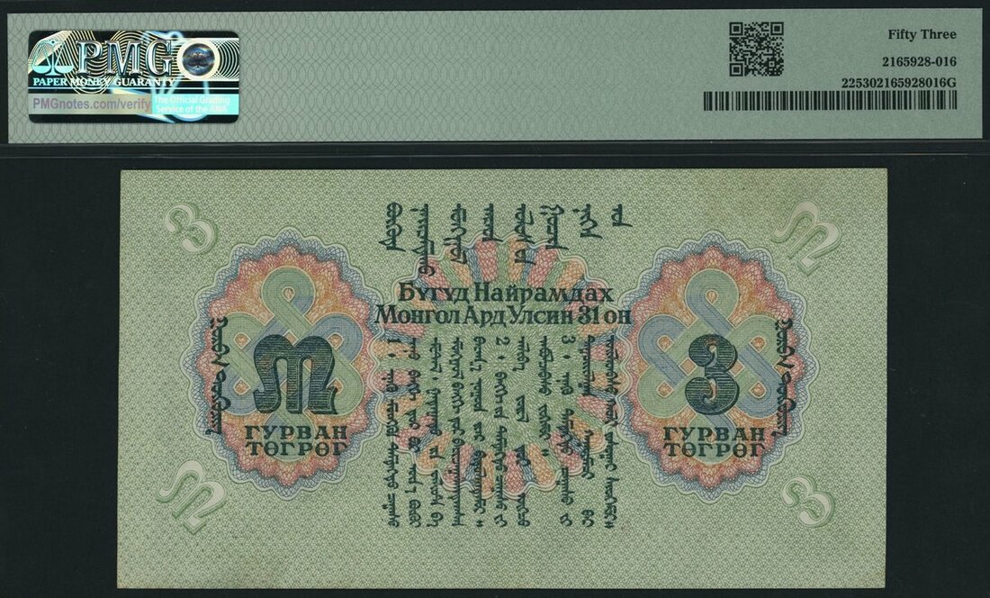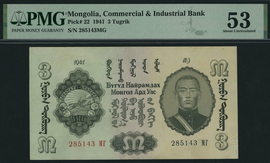 (x) Commercial and Industrial Bank, Mongolia, 3 Tugrik, 1941, serial number 285143 MG, (Pick 22, BNB 216), in PMG holder 53 About Uncirculated