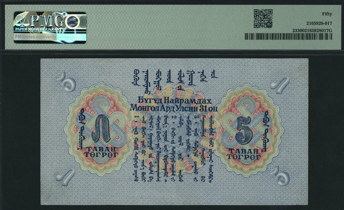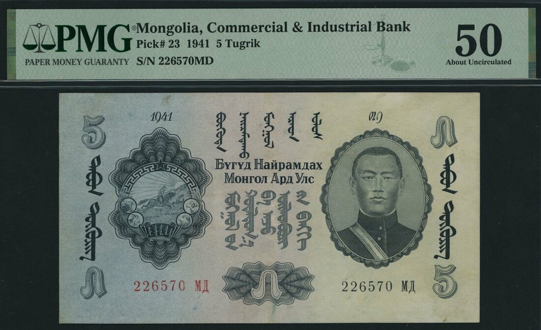 (x) Commercial and Industrial Bank, Mongolia, 5 Tugrik, 1941, serial number 226570 MD, (Pick 23, BNB 217), in PMG holder 50 About Uncirculated