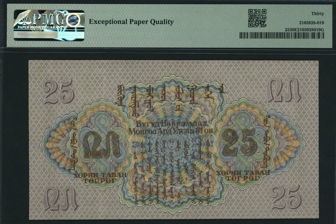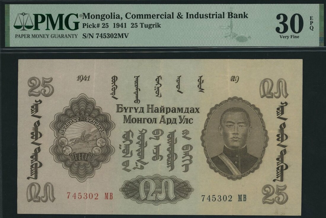 (x) Commercial and Industrial Bank, Mongolia, 25 Tugrik, 1941, serial number 745302 MV, (Pick 25, BNB 219), in PMG holder 30 EPQ Very Fine, only 7 notes in higher grade on PMG census