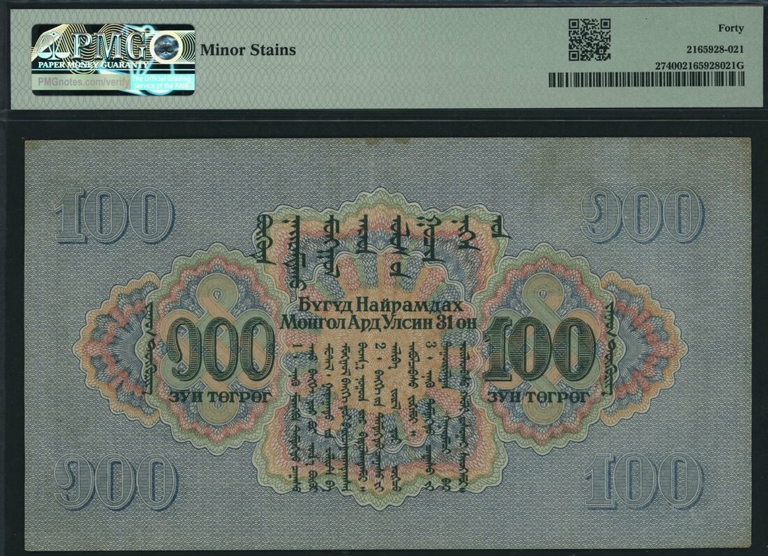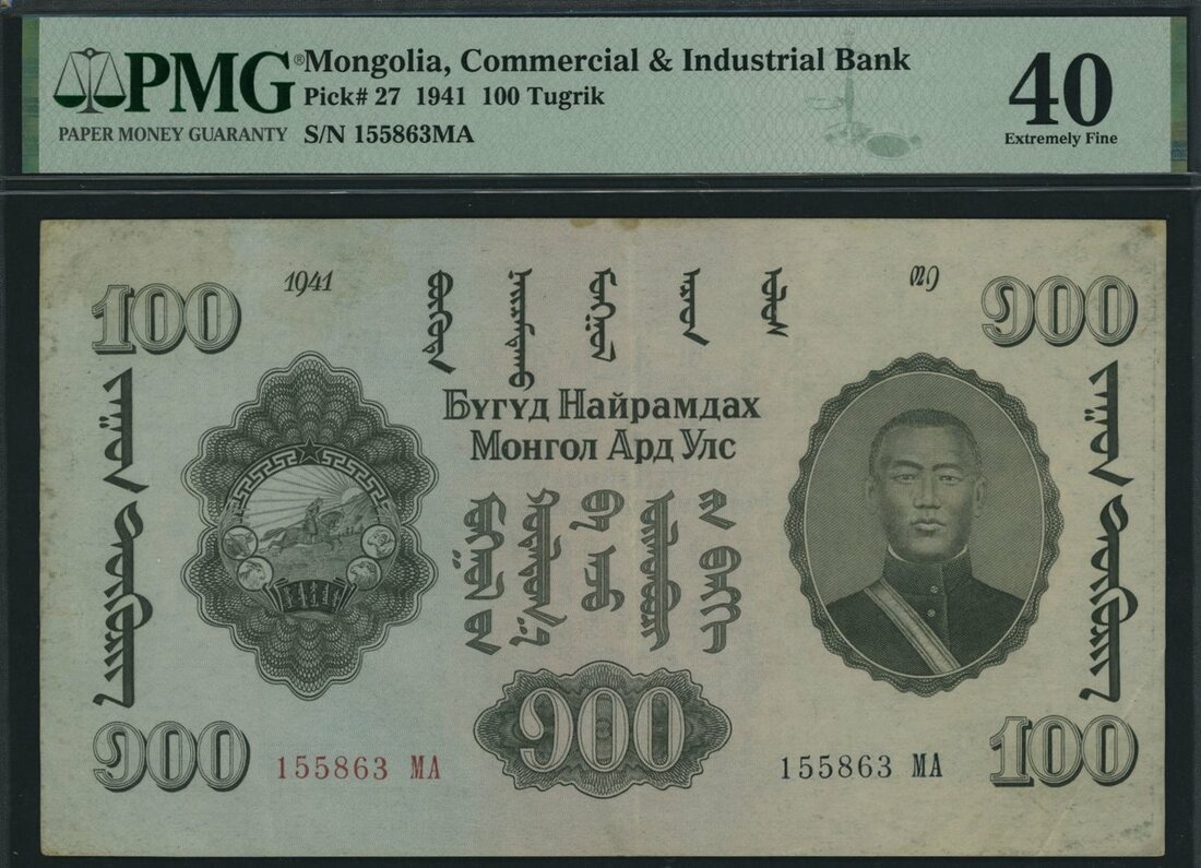 (x) Commercial and Industrial Bank, Mongolia, 100 Tugrik, 1941, serial number 155863 MA, (Pick 27, BNB 221), in PMG holder 40 Extremely Fine, minor stains, only 3 notes in higher grade on PMG census