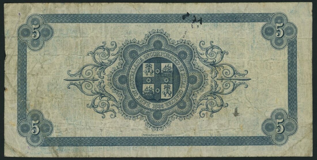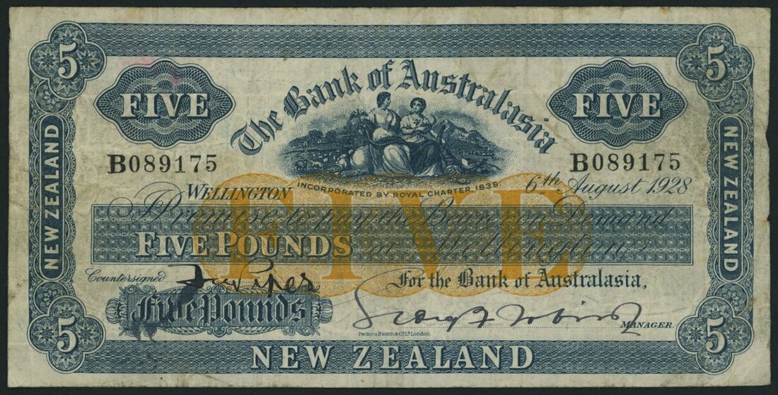(x) Bank of Australasia, 5 Pounds, Wellington, 6th August 1928, serial number B089175, sixth issue uniform series 1, imprint of Perkins, Bacon & Co. London,