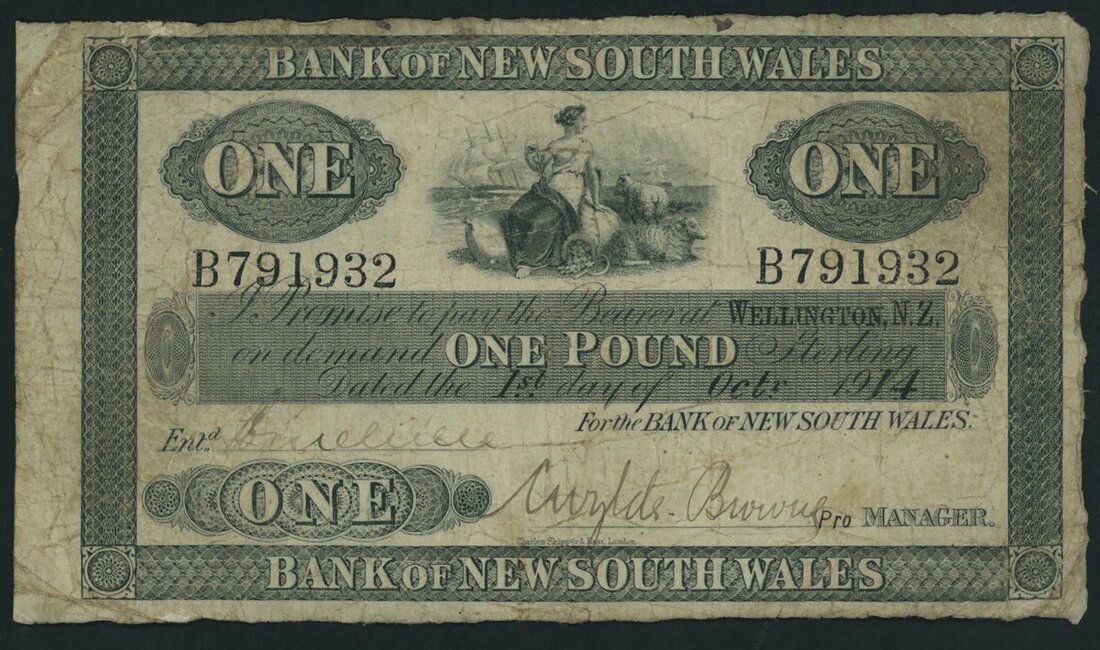 (x) Bank of New South Wales, 1 Pound, Wellington, 1st October 1914, serial number B791932, forth issue, imprint of Charles Skipper & East, London,