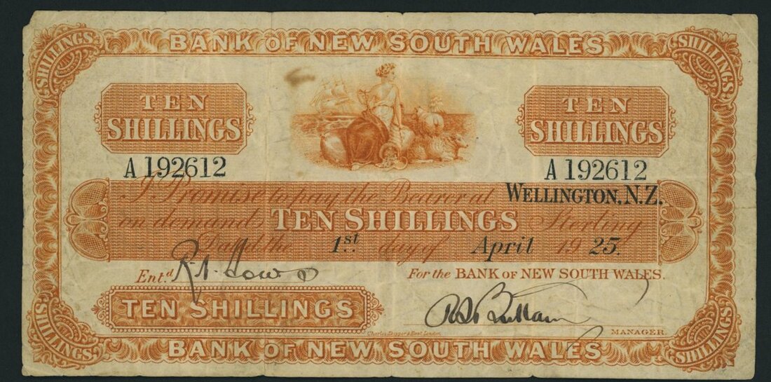 (x) Bank of New South Wales, 10/- Shillings, Wellington, 1st April 1925, serial number A192612, sixth issue uniform series, with ´Sterling´, imprint of Charles Skipper & East, London,