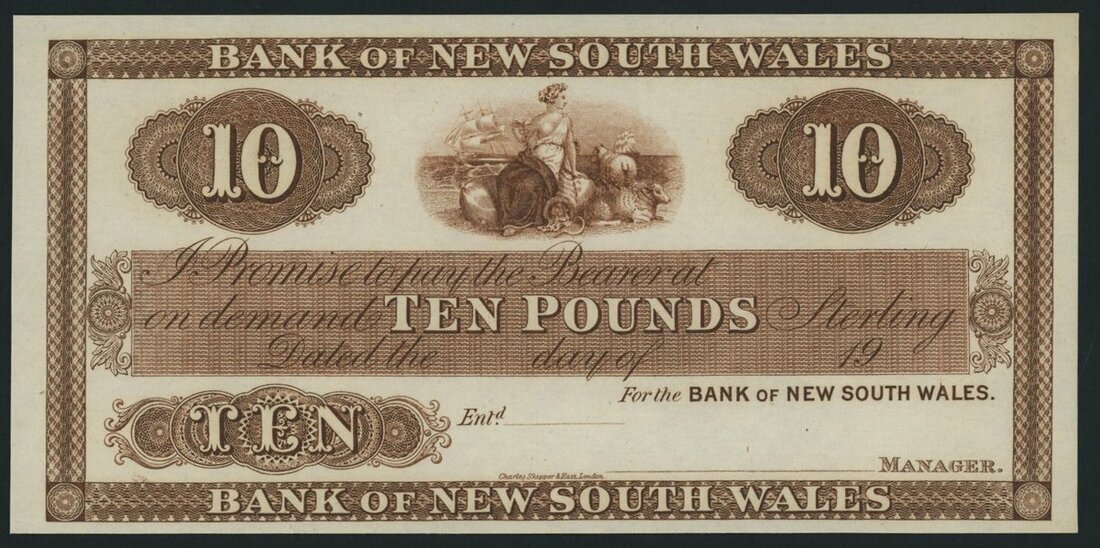 (x) Bank of New South Wales, proof 10 Pounds, 19-- (1924-34), without serial numbers & domicile, sixth issue uniform series, with "Sterling", uniface imprint of Charles Skipper & East, London,