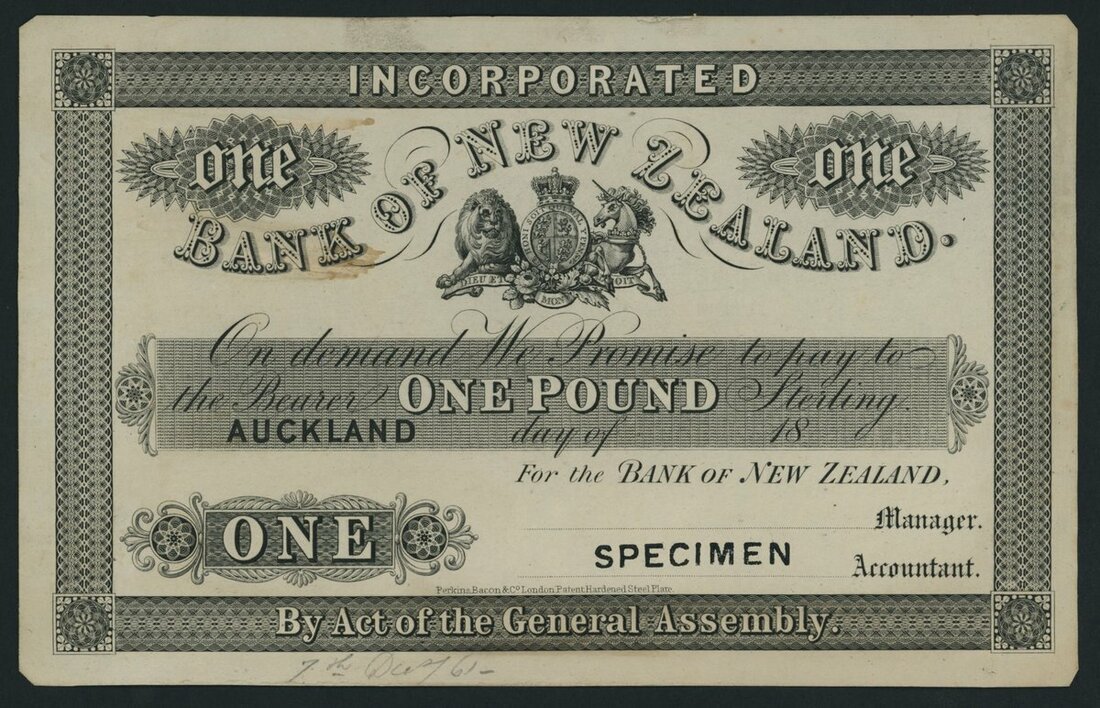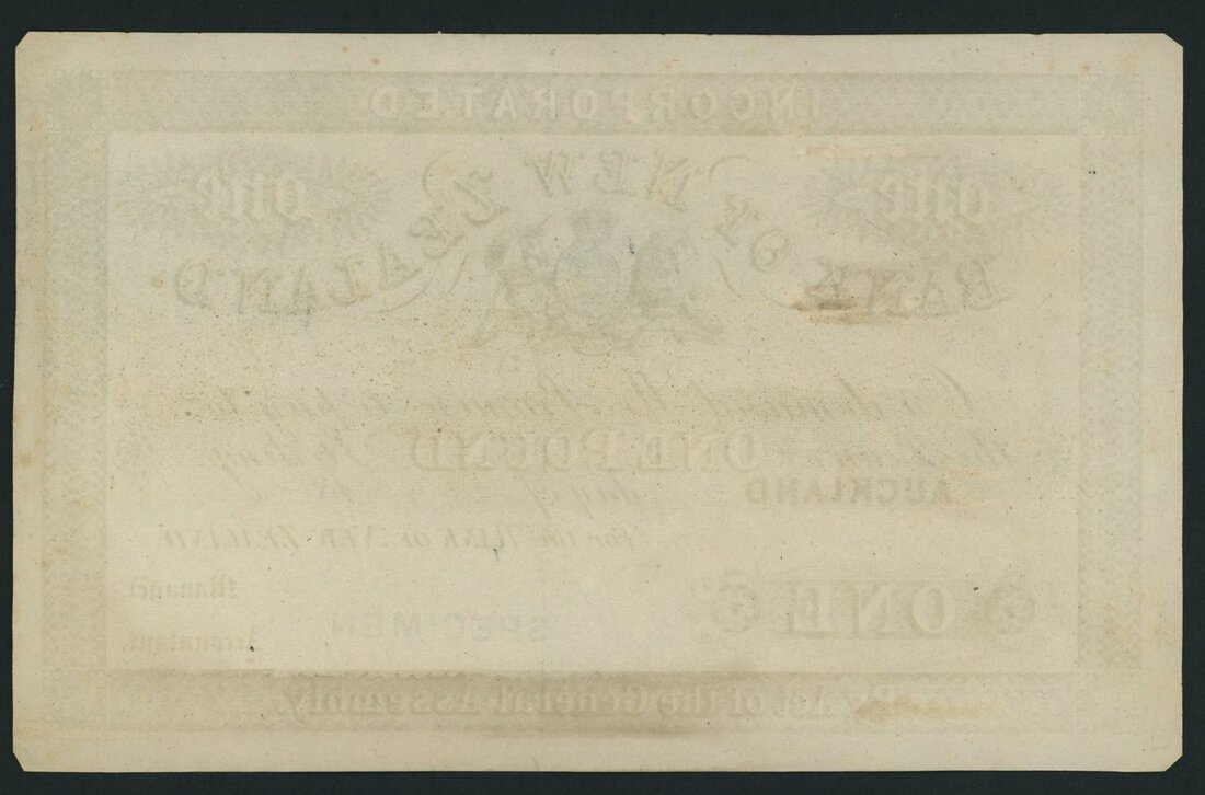 (x) Bank of New Zealand, specimen 1 Pound, Auckland, 18xx (ND ca. 1862-73), no serial number, second issue,