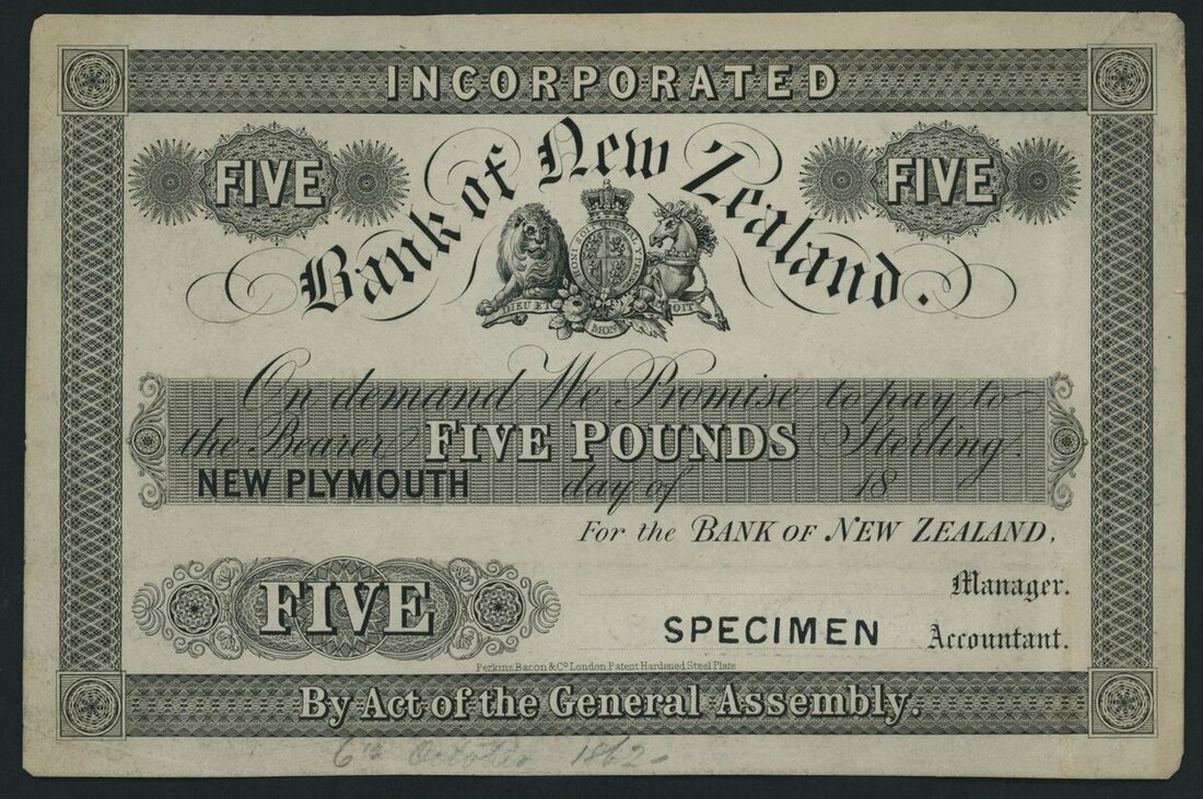 (x) Bank of New Zealand, specimen 5 Pounds, New Plymouth, 18xx (ND ca. 1862-73), no serial number, second issue,