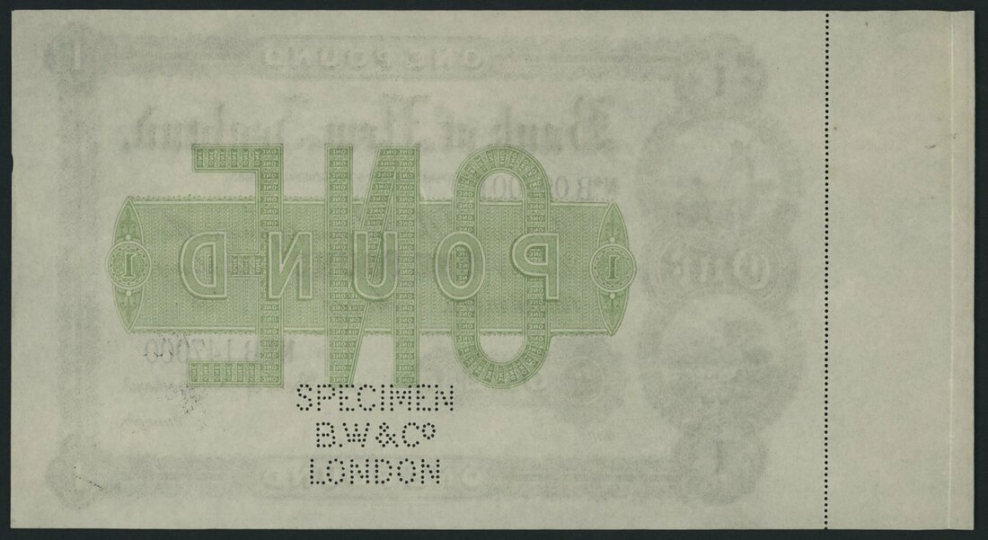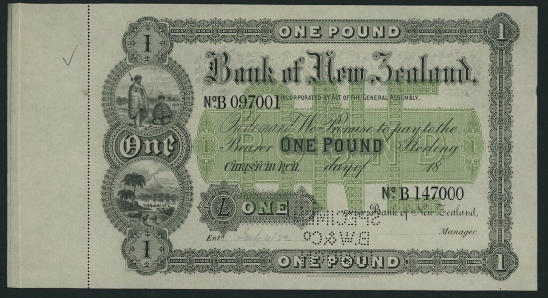 (x) Bank of New Zealand, specimen 1 Pound, 1870-1929, serial number range B 097001- B 147000, Christchurch domicile, third issue,