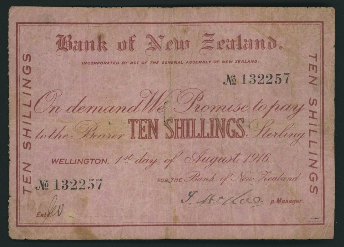 (x) Bank of New Zealand, 10 Shillings, 1st of August 1916, serial number 132257, first date of issue, without printer´s name, date printed,