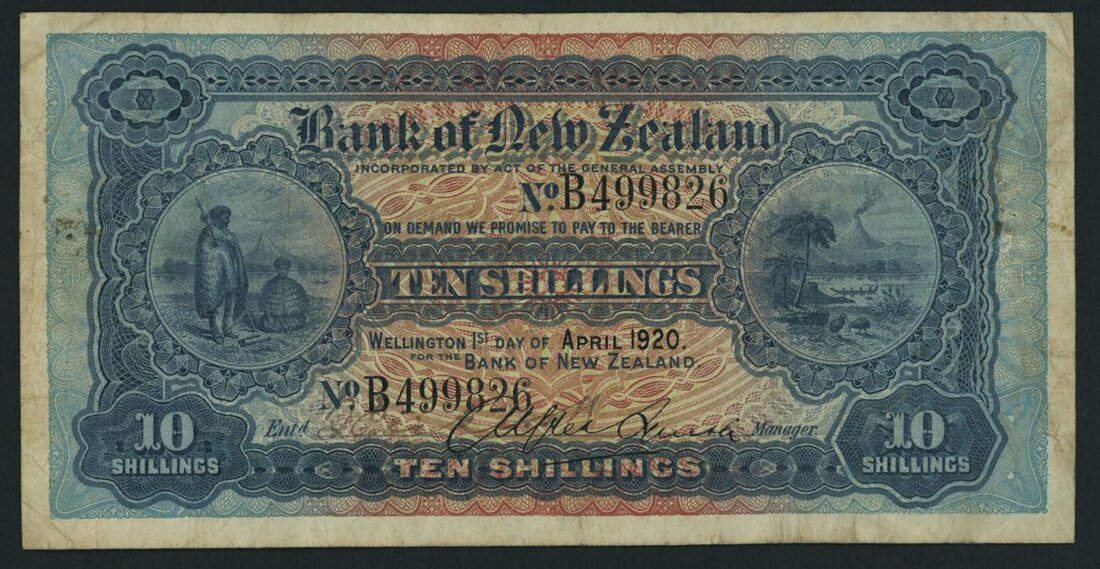 (x) Bank of New Zealand, 10 Shillings, 1st April 1920, serial number B499826, (Pick S224, Robb D.711, L.458), about fine, staining