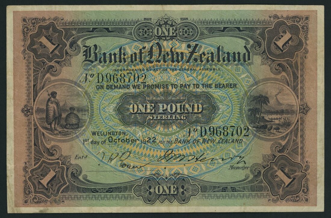 (x) Bank of New Zealand, 1 Pound, 1st October 1922, serial number D968702, seventh issue,