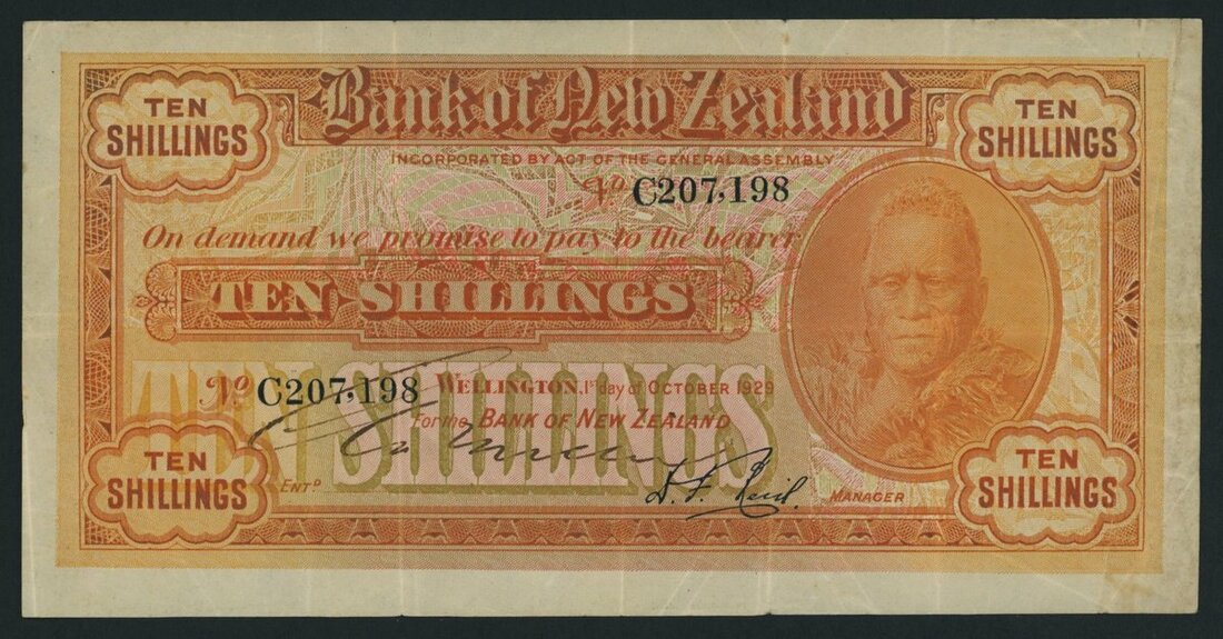 (x) Bank of New Zealand, 10 Shillings, Wellington 1st October 1929, serial number C207198, ninth issue uniform series 2, D. F. Reid signature,