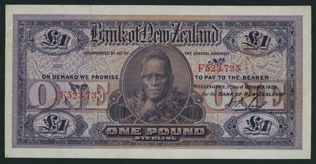 (x) Bank of New Zealand, 1 Pound, Wellington, 1st October 1929, serial number F523735, ninth issue uniform series 2, D. F. Reid signature,