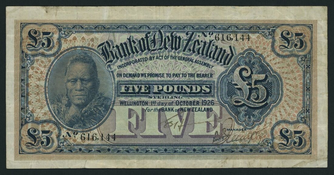 (x) Bank of New Zealand, 5 Pounds, Wellington, 1st October 1926, serial number 616144, eighth issue uniform series 1,