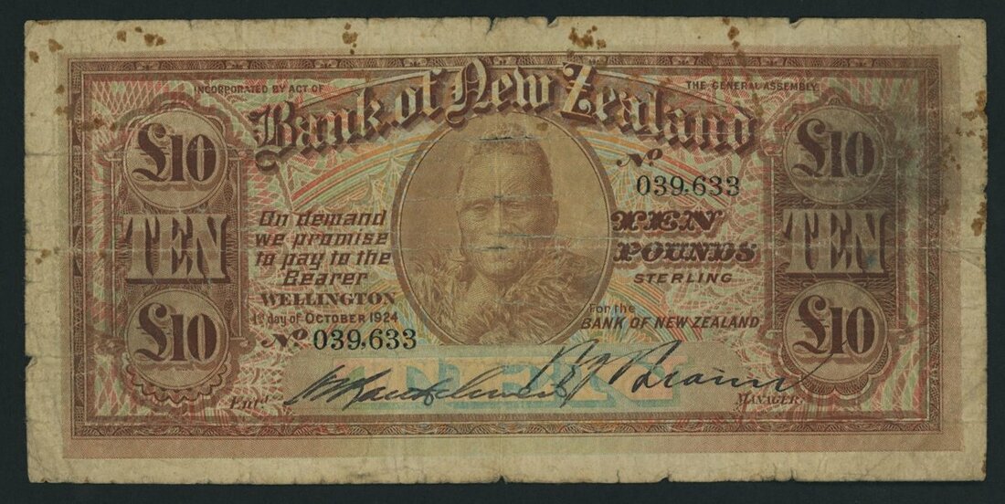 (x) Bank of New Zealand, 10 Pounds, 1st October 1924, serial number 039633, eighth issue uniform series 1,