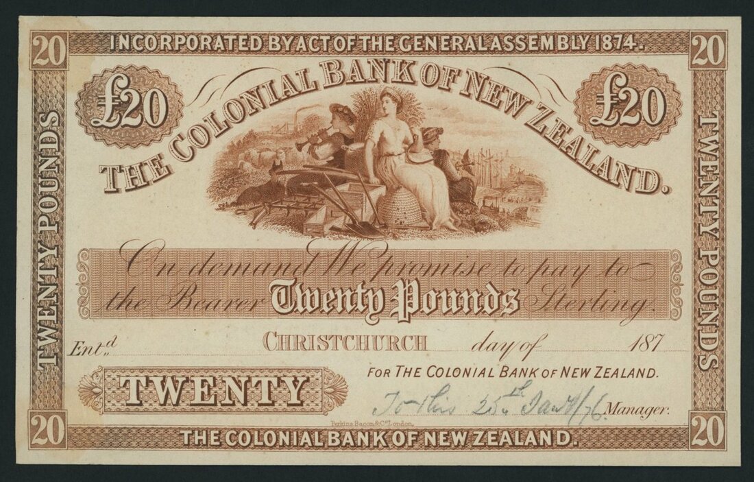 (x) Colonial Bank of New Zealand, proof 20 Pounds, Christchurch, 187x, second issue,