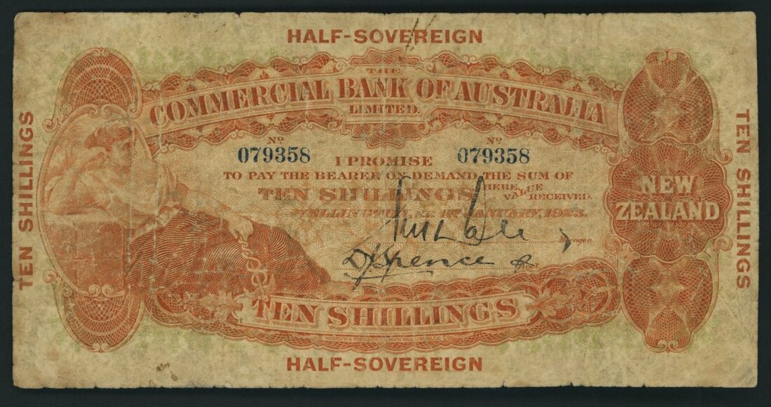 (x) Commercial Bank of Australia Limited, New Zealand, 10/- Shillings = 1/2 Sovereign, Wellington, 1st January 1923, serial number 079358, third issue,