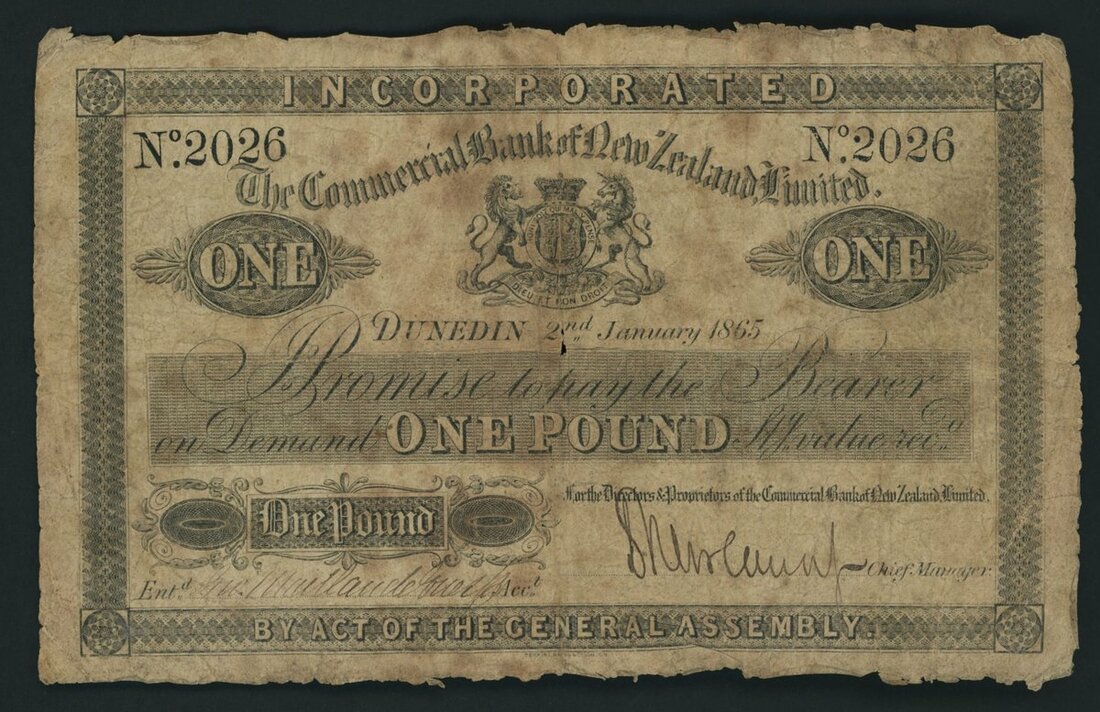 (x) Commercial Bank of New Zealand Limited, 1 Pound, Dunedin, 2nd January 1865, serial number 2026, (Pick S288, Clifford J124), very good, toned, staining, pinholes, ex Aventine coins & bullion private treaty