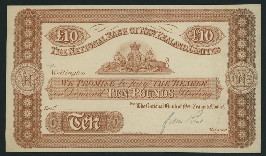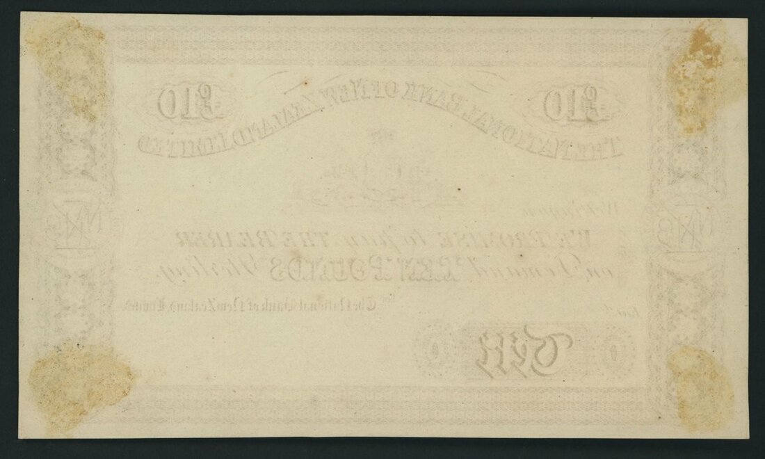 (x) National Bank of New Zealand Limited, proof 10 Pounds, Wellington, ND (ca. 1873-77), first issue, office of issue (Wellington) unlisted on pick catalogue,
