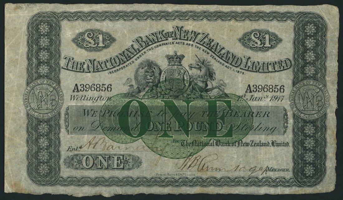 (x) National Bank of New Zealand Limited, 1 Pound, 1st January 1917, serial number A396856, third issue, Wellington Domicile,