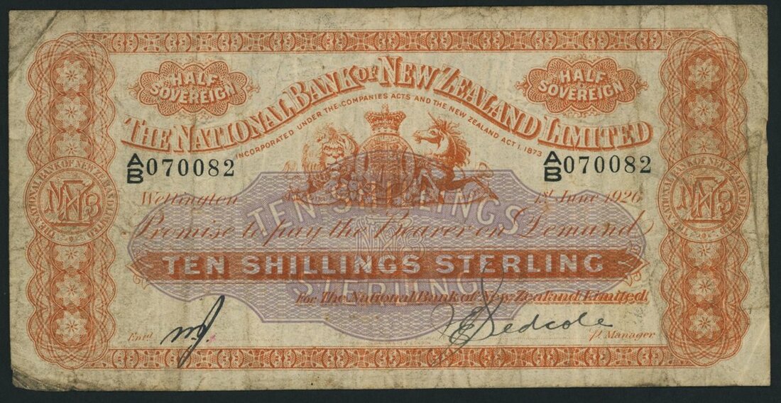 (x) National Bank of New Zealand Limited, 10 Shillings = 1/2 Sovereign, 1st June 1926, serial number A/B 070082, fourth issue,