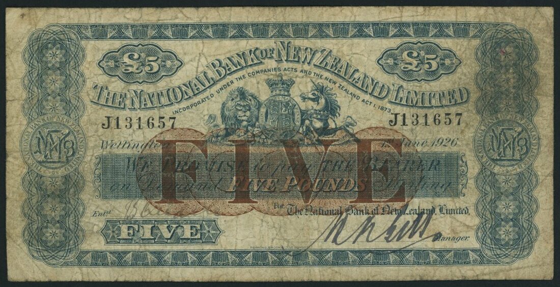 (x) National Bank of New Zealand Limited, 5 Pounds, 1st June 1926, serial number J131657, fourth issue,