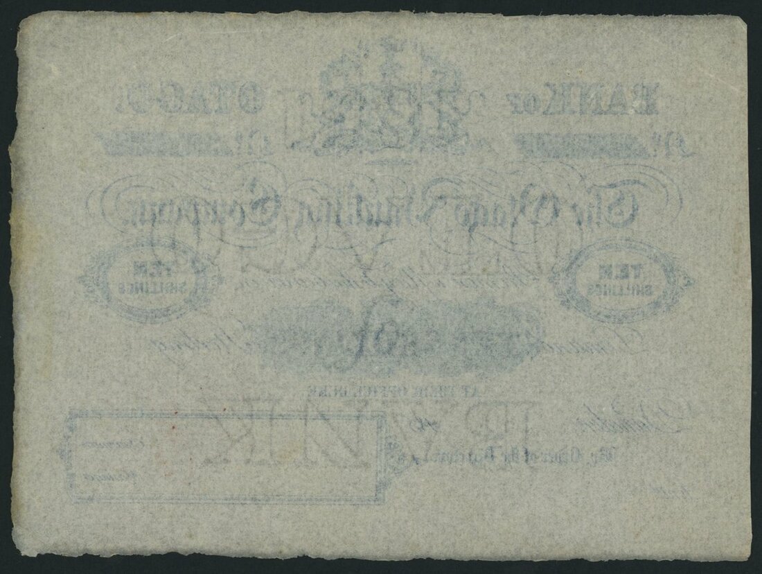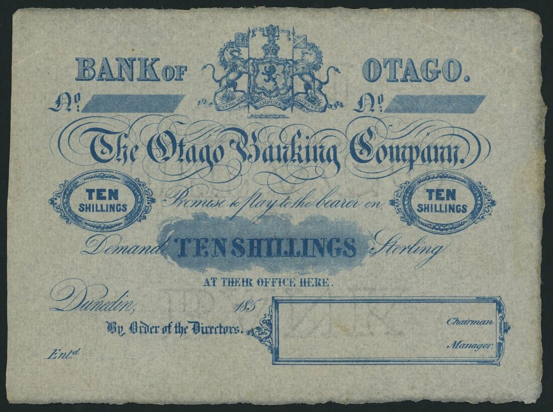 (x) Bank of Otago, New Zealand, unissued 10/- Shillings, Dunedin, 185x (ca. 1851), (Pick S336, Robb.P.T.U.14a, Sutherland pp.185 and others, Hargreaves pp.65-75, Clifford U811), very fine, pinholes, rust, light staining