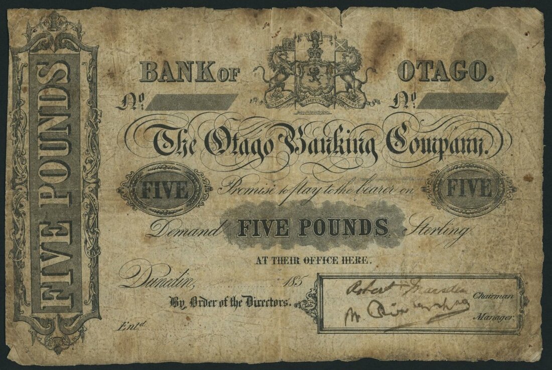 (x) Bank of Otago, New Zealand, unissued 5 Pounds, Dunedin, 185x (ca. 1851), (Pick S338, Clifford U815), very good, holes, tears, staining