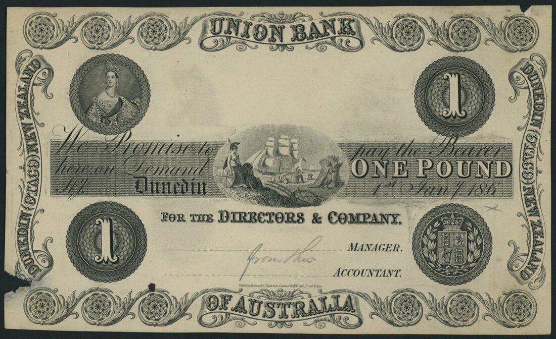 (x) Union Bank of Australia, New Zealand, proof 1 Pound, Dunedin, 1st January 186-, no serial number, second issue, partial date printed,