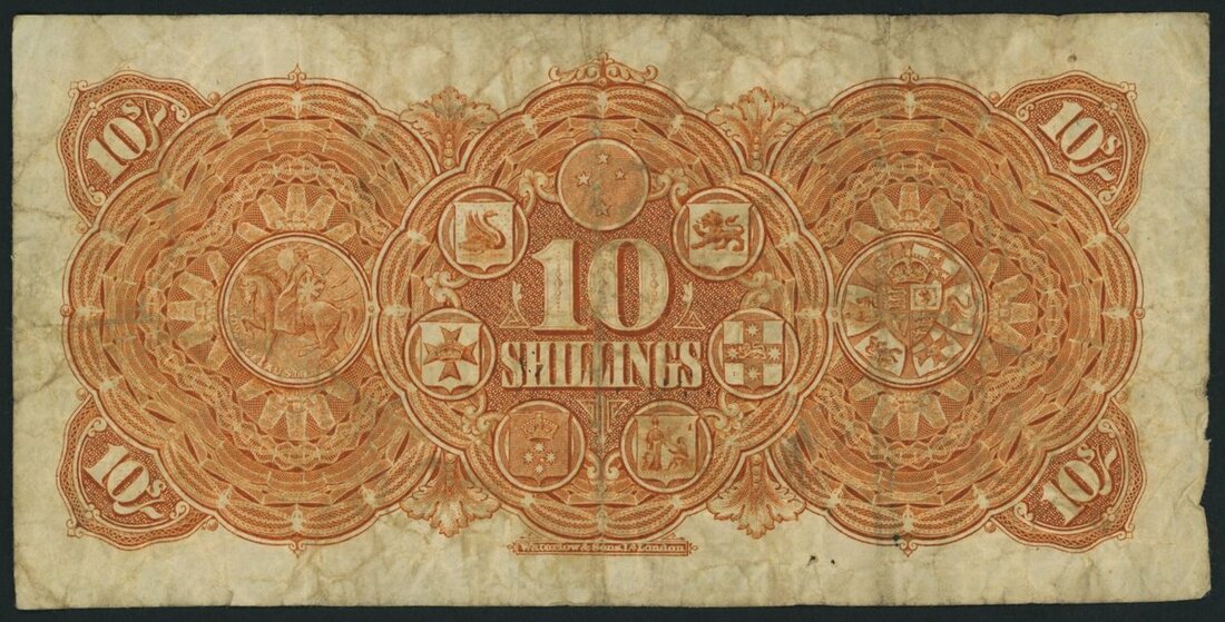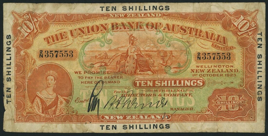 (x) Union Bank of Australia Limited, New Zealand, 10/- Shillings, Wellington, 1st October 1923, serial number 2/N 357553, sixth issue uniform series 1, with "Sterling",