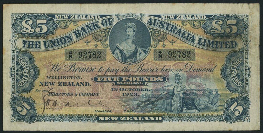 (x) Union Bank of Australia Limited, New Zealand, 5 Pounds, Wellington, 1st October 1923, serial number 4/N 92782, sixth issue uniform series 1,