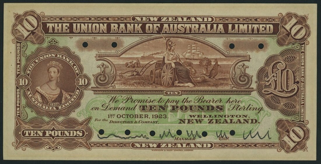 (x) Union Bank of Australia Limited, New Zealand, specimen 10 Pounds, Wellington, 1st October 1923, no serial number, sixth issue uniform series 1, imprint of Waterlow & Sons Limited, London,