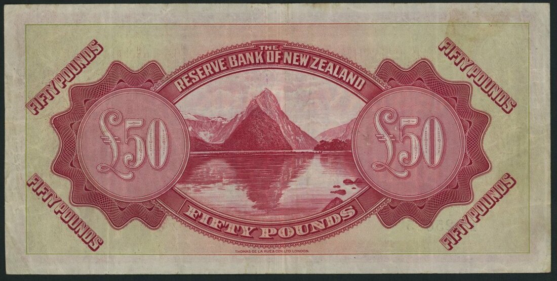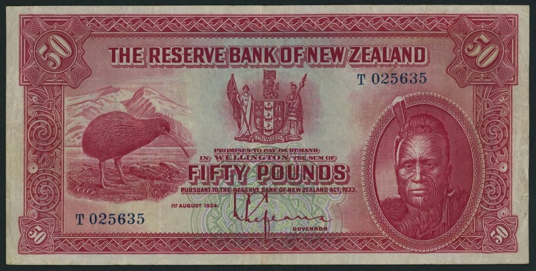(x) Reserve Bank of New Zealand, 50 Pounds, 1st August 1934, serial number T 025635, Leslie Lefeaux signature, the first Governor of the Reserve Bank of New Zealand,