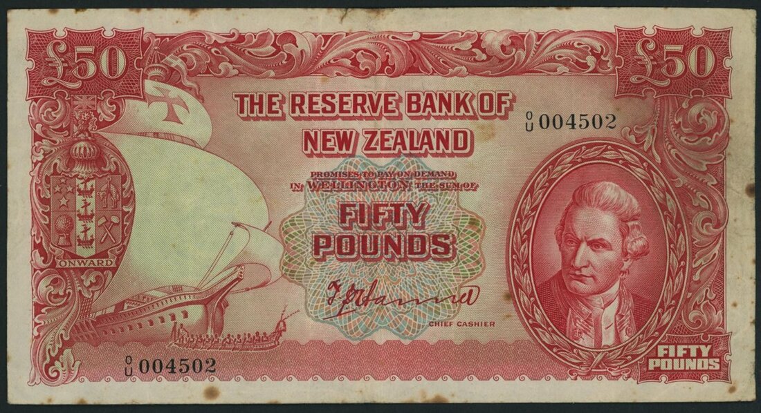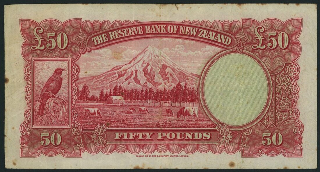 (x) Reserve Bank of New Zealand, £50, ND (1940-55), serial number 0/U 004502, Hanna type 1 font. (16 known, pepping, pre-decimal history noted),