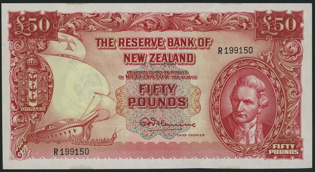 (x) The Reserve Bank of New Zealand, 50 Pounds, ND (1956-67), serial number R199150, R. N. Fleming signature,