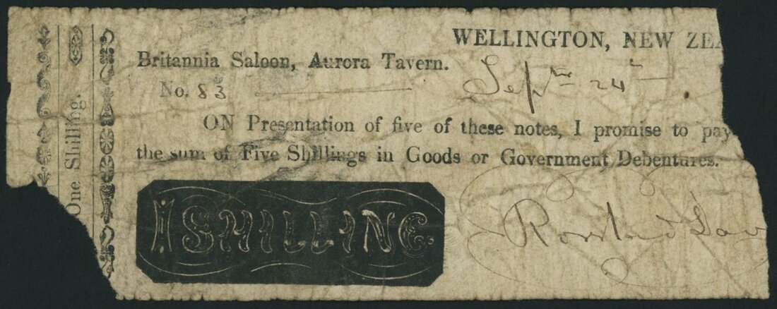 (x) Britannia Sallon Promissory Note, Aurora Tavern, private promissory note for 1 Shilling, Wellington, 24th September (1845), serial number 83,
