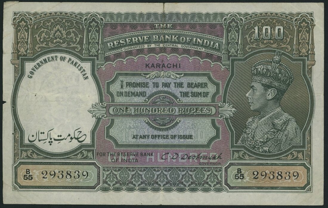 (x) Government of Pakistan, 100 Rupees, ND (1948), B/55 293839, (Pick 3A), very good, tape repair down centre on reverse of note, tears into border and design, pinholes, staining