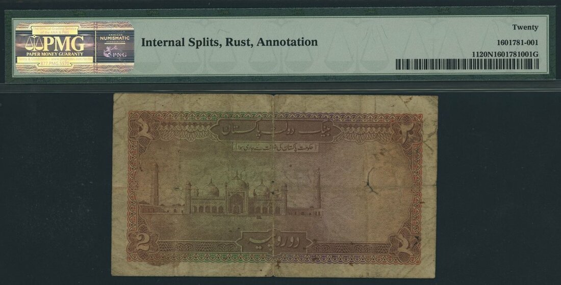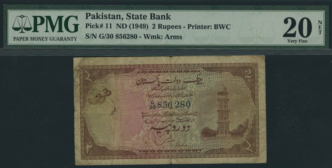 (x) State Bank, Pakistan, 2 Rupees, ND (1949), serial number G/30 856280, (Pick 11), in PMG holder 20 NET Very Fine, internal splits, rust, annotation
