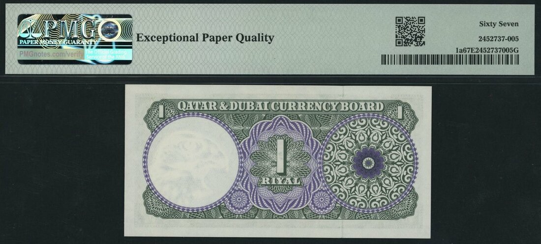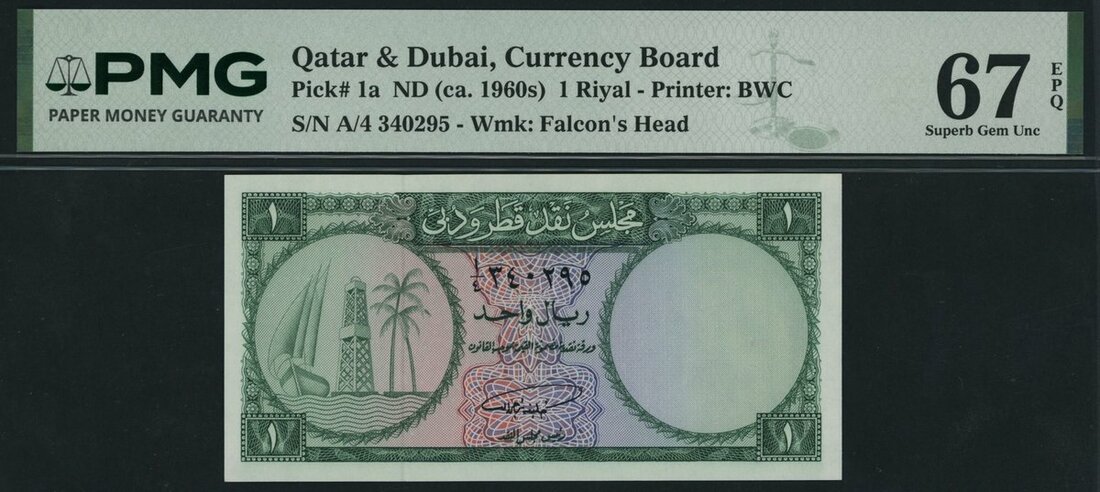 (x) Qatar & Dubai Currency Board, 1 Riyal, ND (ca. 1960s), serial number A/4 340295, (Pick 1a), in PMG holder 67 EPQ Superb Gem Uncirculated, only 9 notes in higher grades on PMG census