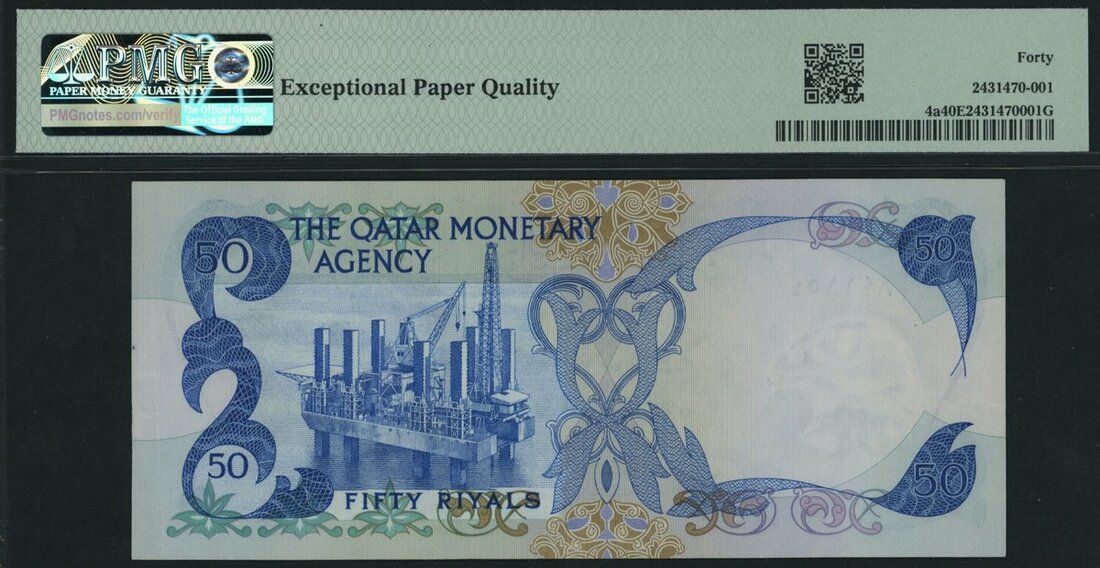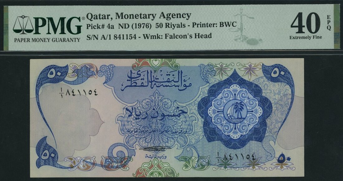 Qatar Monetary Agency, 50 Riyals, ND (1976), serial number A/1 841154, (Pick 4a), in PMG holder 40 EPQ Extremely Fine, desirable and considerably scarcer with EPQ designation