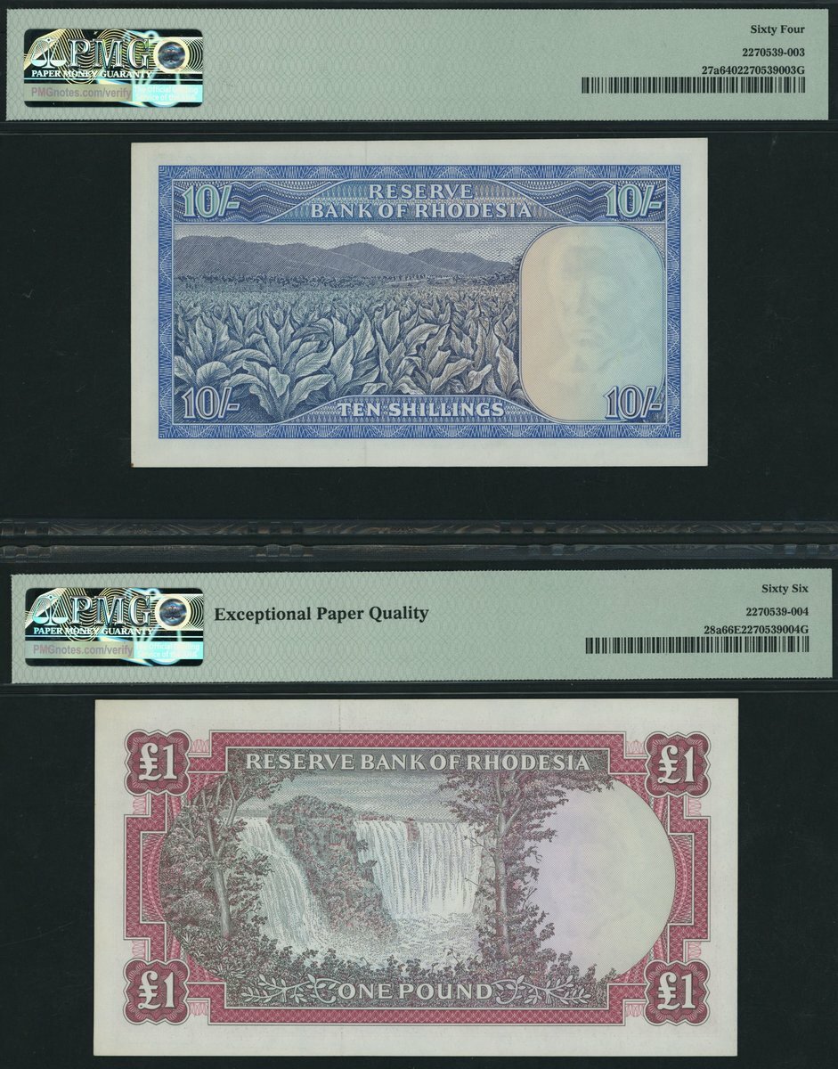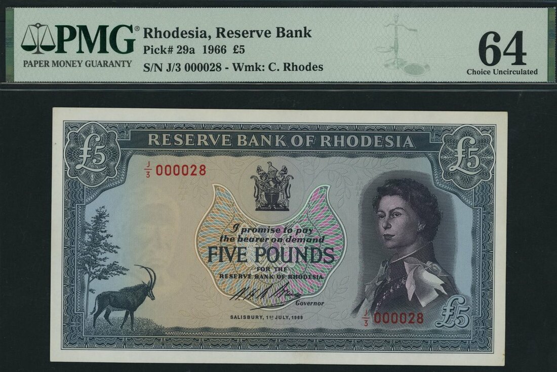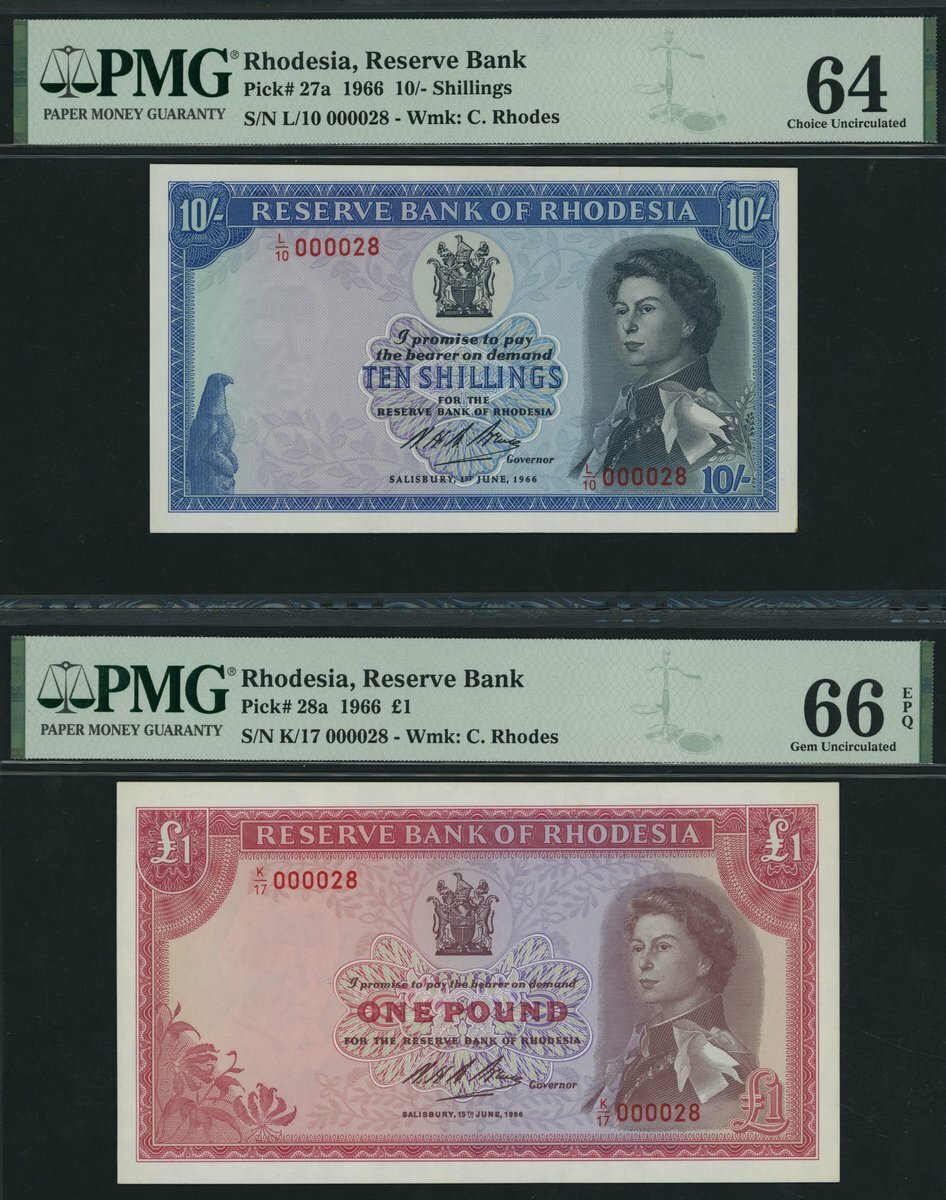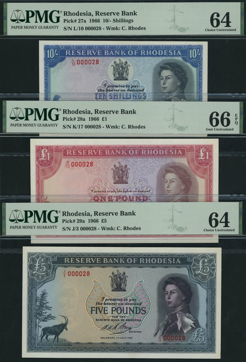 Reserve Bank of Rhodesia, [3 notes] 10/- Shillings, £1 & £5, 1966, matching low serial numbers 000028,