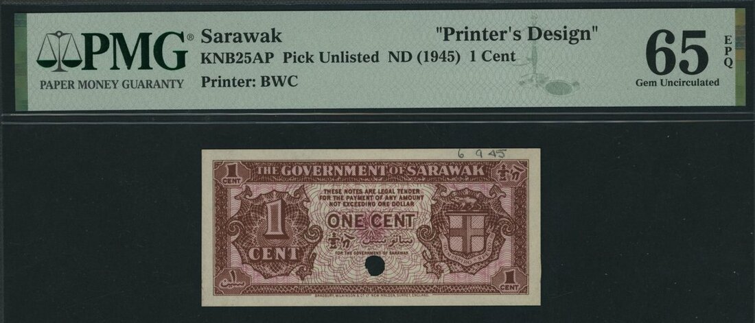 Government of Sarawak, 'Liberation Note Issue', uniface specimen 1 Cent, ND (1945),