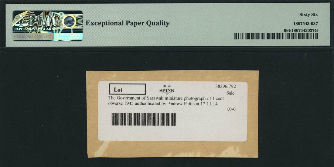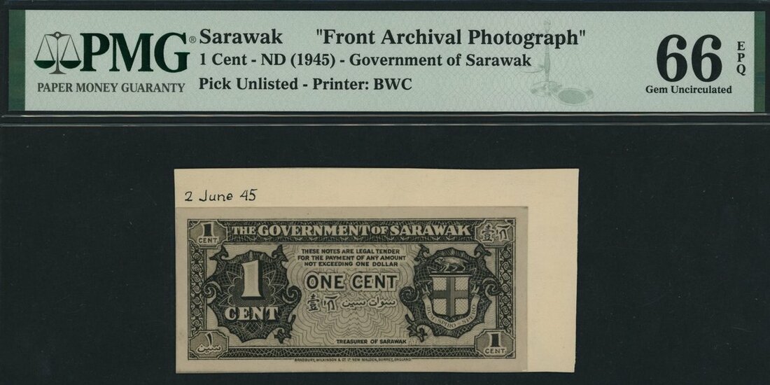 Government of Sarawak, front archival photograph for 1 Cent, 2nd June 1945, (BNB B219, KNB25AP, Pick Unlisted), in PMG holder 66 EPQ Gem Uncirculated