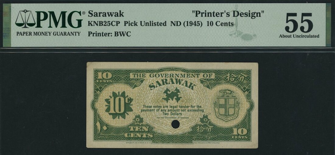 It was also proposed that an issue of small change notes for Sarawak would be required and accordingly a series of small change currency notes comprising 1, 5 and 10 cents notes were designed and printed by Bradbury Wilkinson in the UK. It is almost certain that these notes were never printed in any quantity and the issue was never put into circulation.