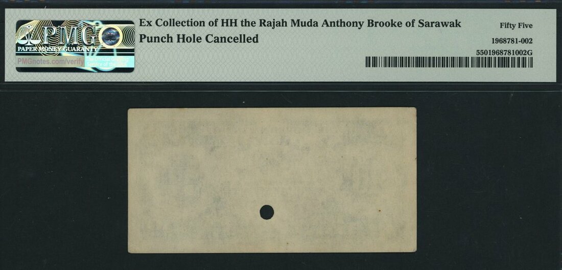 (BNB B221, KNB25CP, Pick Unlisted), in PMG holder 55 About Uncirculated, Ex Collection of HH the Rajah Muda Anthony Brooke of Sarawak, punch hole cancelled, extremely rare