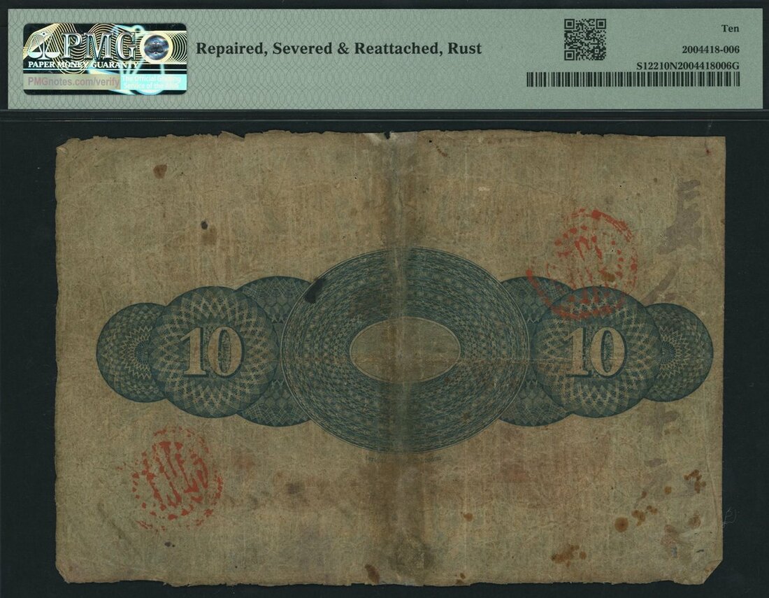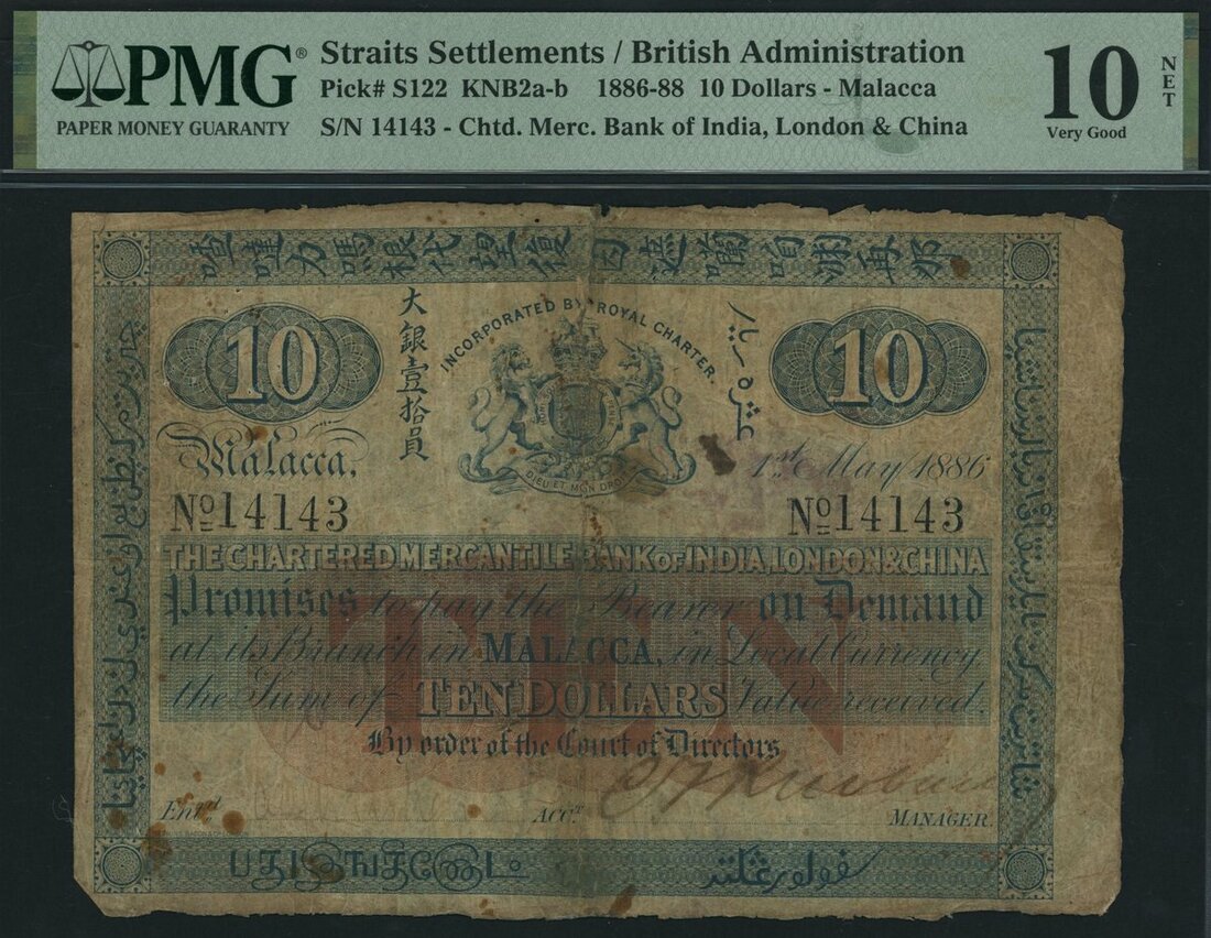 Chartered Mercantile Bank of India, London & China, Straits Settlements, 10 Dollars, Malacca, 1st May 1886, serial number 14143, (Pick S122), in PMG holder 10 NET Very Good, repaired, severed & reattached, rust, one of only two notes of this type on PMG census, the other at 15 Choice Fine, Ex Frank Goon Collection, a superbly elusive Malacca issue, outstandingly rare