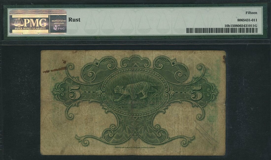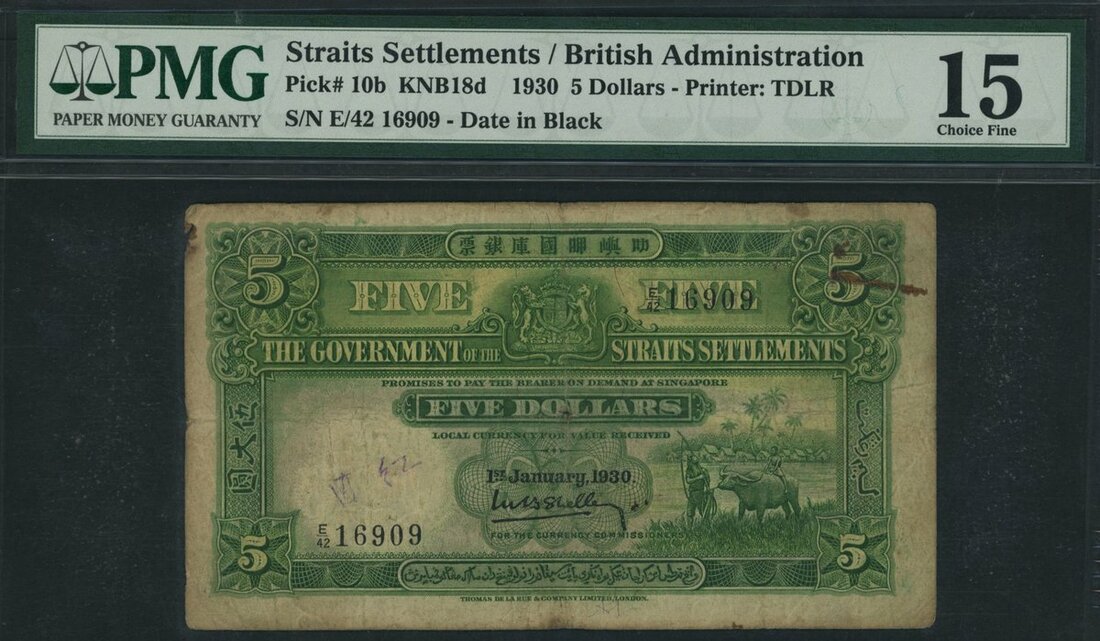 Government of the Straits Settlements, 5 Dollars, 1st January 1930, serial number E/42 16909, (Pick 10b), in PMG holder 15 Choice Fine,