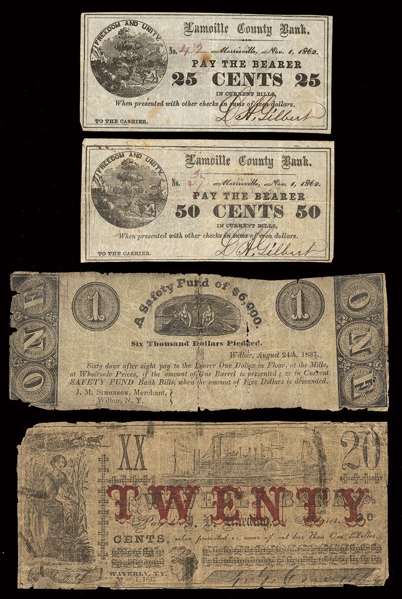 1-2) D. A. Gilbert - Lamoille County Bank. Morrisville. This town is not listed in Harris. Nov. 1st, 1862. 25 Cents & 50 Cents. Both notes with a round seal with tree and cows, left. Both notes have a woman holding a spear on the backs. Both Fine-VF, the first with light stains. 3) J. M. Simonson. Wilbur. $1. Aug. 24, 1837. City not listed in Harris. About Good. Basically intact, but there are long internal splits, and pieces missing from the edges. "A Safety Fund of $6,000" over two women. 4) A. G. C--------. Waverly. Nov. 1st, 1862. Riverboat. Red TWENTY. Green back. VG, with repaired splits and tears. [4].
