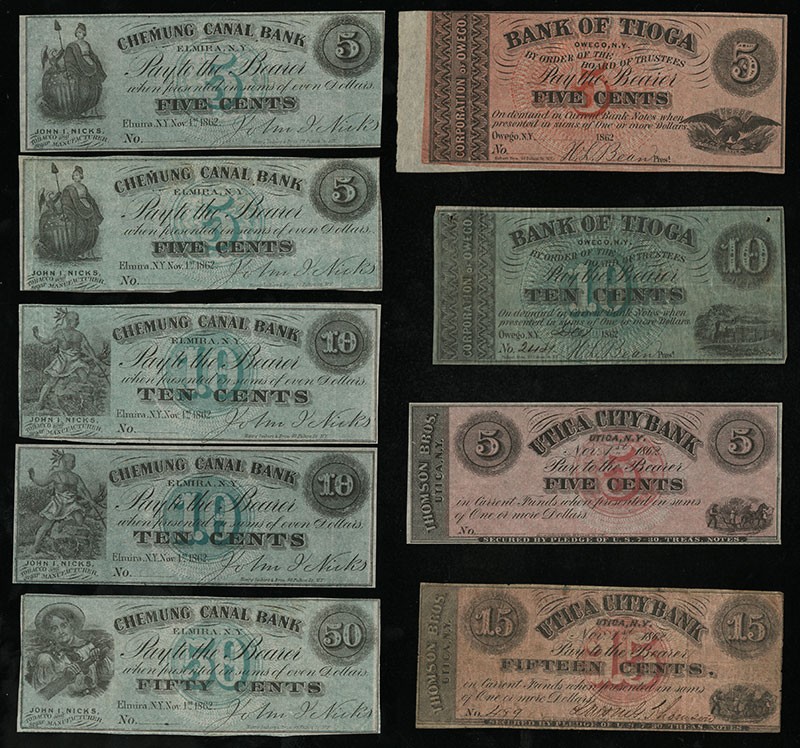 NY. Colorful Group of New York Scrip Notes with Full Tints. 1-5) John Nicks. Elmira. 5, 5, 10, 10 and 50 Cents. Green. EF-AU, VF, VF, AU, EF. 6-7) Corporation of Owego - Bank of Tioga. 5 Cents. Red. VF; 10 Cents. Green. Fine. 8-9) Thompson Brothers. Utica City Bank. 5 Cents. Red. VF details, tape repair; 15 Cents. Red. About Fine. [9]