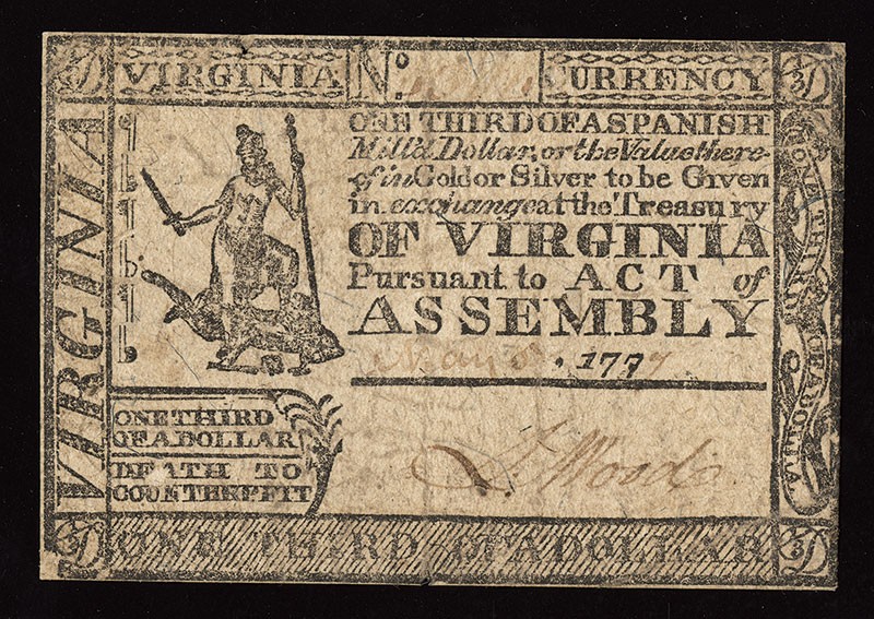 Virginia. May 6, 1777. $1/3. (VA-113) Woman with sword. Signed by Wood. Fine details. Edge repairs.