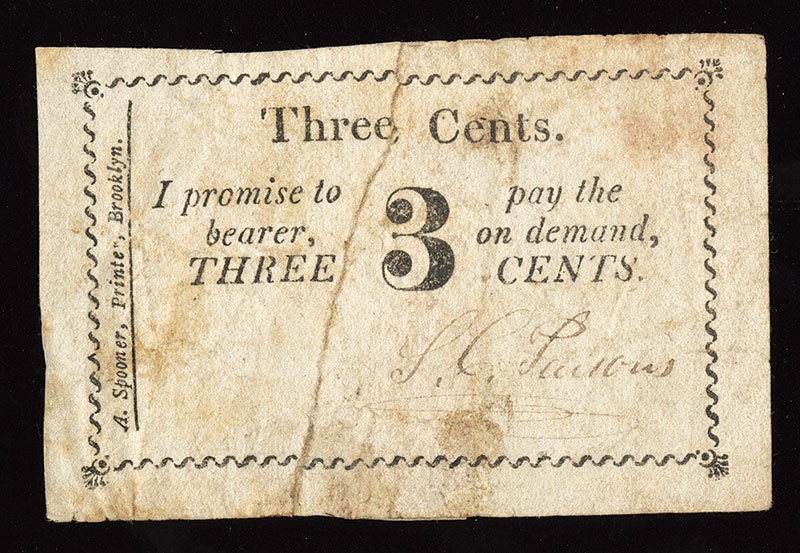 NY. Brooklyn. S. C. Parsons. 3 Cents. Not dated, but probably War of 1812 period. Large 3 at center. Fine details, split in half and backed with paper.
